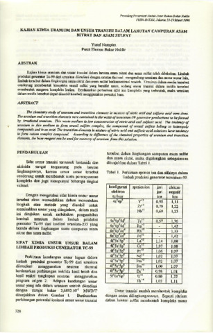 Kajian kimia uranium dan unsur transisi dalam larutan asam nitrat dan asam sulfat telah dilakukan. Limbah produksi generator Tc-99 dari uranium diiradiasi dengan neuton thermal mengandung uranium dan unsur unsur lain, limbah tersebut dalam lingkungan asam nitrat dan asam sulfat berkonsentrasi rendah. Uranium dalam media tersebut cenderung membentuk kompleks uranil sulfat yang bersifat asam, sedang unsur transisi dalam media tersebut membentuk sengawa kompleks kation. Berdasarkan perbedaan sifat ion kompleks yang terbentuk, maka uranium dalam media tersebut dapat diambil kembali menggunakan pereaksi basa.