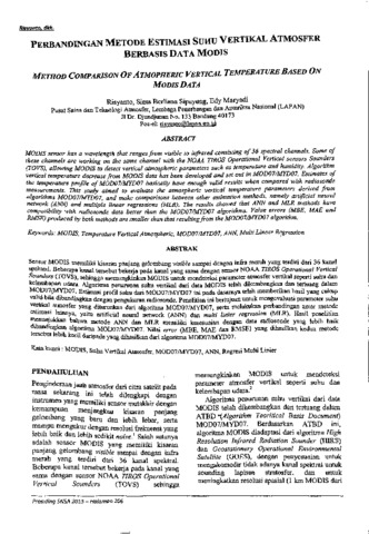 Sensor MODIS memiliki kisaran panjang gelombang visible sampai dengan infra merah yang terdiri dari 36 kanal spektral. Beberapa kanal tersebut bekerja pada kanal yang sama dengan sensor NOAA TIROS Operational Vertical Sounders (TOVS), sehingga memungkinkan MODIS untuk mendeteksi parameter atmosfer vertikal seperti suhu dan kelembapan udara. Algoritma penurunan suhu vertikal dari data MODIS telah dikembangkan dan tertuang dalam MOD07NYD07. Estimasi profil suhu dari MOD07/MYD07 ini pada dasarnya telah memberikan hasil yang cukup valid bila dibandingkan dengan pengukuran radiosonde. Penelitian ini bertujuan untuk mengevaluasi parameter suhu vertikal atmosfer yang diturunkan dari algoritma MOD07/MYD07, serta melakukan perbandingan antar metode estimasi lainnya, yaitu artificial neural network (ANN) dan multi linier regression (MLR). Hasil penelitian menuni.uldcan bahwa metode ANN dan MLR memiliki kesesuaian dengan data radiosonde yang lebih baik dibandingkan algortima MOD07/MYD07. Nilai error (MBE, MAE dan RMSE) yang dihasilkan kedua metode tersebut lebih kecil daripada yang dihasilkan dari algoritma MOD07/MYD07.
