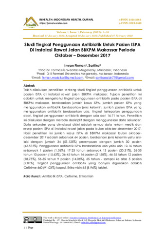 Imran, Firman and Sartika, Sartika (2022) Studi tingkat penggunaan antibiotik untuk pasien ISPA di instalasi rawat jalan BBKPM Makassar periode Oktober-Desember 2017. Indonesian Health Journal, 1 (1): 1. pp. 1-10. ISSN 2829-0542