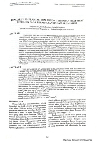 Telah dilakukan implantasi ion argon ke dalam permukaan bahan Al (aluminium) dengan tujuan untuk mendapatkan sifat mekanik baru yang lebih baik dengan meningkatkan kekerasan dan memperbaiki ketahanan terhadap keausan dari permukaan bahan. Teknik implantasi ion digunakan untuk mengimplantasikan ion-ion argon ke dalam permukaan Al pada energi ion 40 keV untuk berbagai variasi dosis ion dari 4,46x 10¹⁶ sampai dengan 1,25 x 10¹⁷ ion/cm². Uji kekerasan-mikro dilakukan dengan peralatan Vickers-microhardness, dan uji ketahanan terhadap keausan dilaksanakan dengan mengukur kedalaman jejak yang terjadi pada permukaan cuplikan terhadap variasi beban dari 25 gram sampai dengan 500 gram. Berdasarkan penelitian diperoleh bahwa tingkat kekerasan dan ketahanan terhadap keausan dari permukaan cuplikan mencapai suatu nilai maksimum pada dosis ion 1,07 x 10¹⁷ ion/cm². nilai kekerasan maksimum 39.58± 2,05 g/mm² .Uji keausan dari cuplikan yang diimplantasi dengan dosis ion 9,82 x 10¹⁶ sampai dengan 1,16x 10¹⁷ ion/cm² diperoleh bahwa keausan permukaan cuplikan meningkat dengan penambahan beban dan keausan terkecil terjadi pada cuplikan yang terimplantasi dengan dosis ion 1,07 x 10¹⁷ ion/cm².