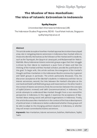 Syafiq, Hasyim (2022) The shadow of Neo-Hanbalism: the idea of Islamic extremism in Indonesia. Islamic Studies Review, 1 (1): 3. pp. 67-94. ISSN 2829-1816