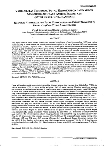 Paper ini bertujuan untuk mempelajari variabilitas diurnal, tahunan dan musiman total hidrokarbon (THC) dan karbon monoksida (CO) di udara ambien perkotaan. Hal ini sangat penting dilakukan mengingat semakin bertambalmya jumlah kendaraan bermotor di kota Bandung yang merupakan salah satu sumber emisi THC dan CO ke udara. THC (terdiri atas metan (CH4) dan hidrokarbon non-metan (NMHC)) dan CO merupakan gas-gas karbon yang keberadaannya di atmosfer dapat mempengaruhi kualitas udara baik sebagai gas rumah kaca maupun gas-gas polutan yang dapat mengganggu kesehatan manusia. Data yang digunakan dalam analisis adalah data THC dan CO hasil pengukuran kontinyu menggunakan instrumen gas analyser di kantor LAPAN Bandung tahun 2010 — 2011. Berdasarkan data rata-rata per-30 menit diketahui bahwa THC dan CO memiliki pola diurnal yang serupa dengan satu puncak maksimum dan satu puncak minimum dimana terjadi peningkatan konsentrasi hingga mencapai maksimum pada pagi dan menjelang sore hari. Hal ini selain karena kondisi topografi juga disebabkan oleh peningkatan volume kendaraan pada saat berangkat dan pulang kerja. Penurunan konsentrasi keduanya pada saat siang hari diakibatkan oleh oksidasi oleh radikal OH dalam proses fotokimia pembentukan ozon. Sedangkan CH4 memiliki pola diurnal dengan dua puncak maksimum dan dua puncak minimum yang berbanding terbalik dengan pola diurnal NMHC dimana konsentrasi NMHC minimum dan konsentrasi CH4 maksimum keduanya ditemukan pada pagi hari. Hal ini menunjukkan adanya pengaruh oksidasi oleh radikal OH yang merupakan sink utama dari CH4 dan CO di atmosfer. Nilai rata-rata musiman CH4, NMHC dan CO ketiganya berkisar masing-masing antara 0,72 ppm — 1,05 ppm, 0,52 ppm — 0,69 ppm dan 0,36 ppm— 0,41 ppm. Berbeda dengan CO, variasi musiman CH4 dan NMHC di Kota Bandung terlihat sangat jelas. Nilai rata-rata tahunan konsentrasi THC dan CO di Kota Bandung mengalami peningkatan pada tahun 2011 jika dibandingkan dengan tahun 2010 masing-masing sebesar 3,96% dan 40,36%.