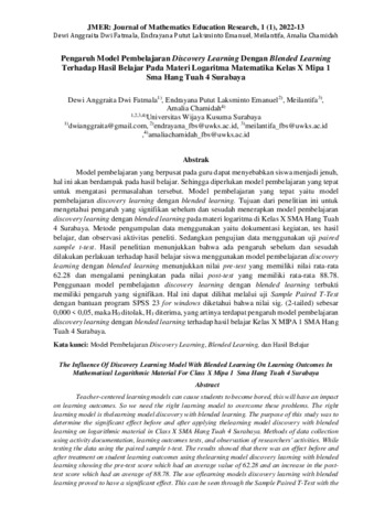 Dewi, Anggraita Dwi Fatmala and Endrayana, Putut Laksminto Emanuel and Meilantifa, Meilantifa and Amalia, Chamidah (2022) Pengaruh model pembelajaran discovery learning dengan blended learning terhadap hasil belajar pada materi logaritma matematika kelas X MIPA 1 SMA Hang Tuah 4 Surabaya. Journal of Mathematic Education Research (JMER), 1 (1): 1. pp. 1-6. ISSN 2829-6001