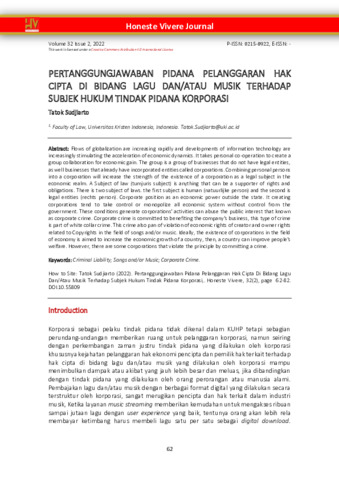 Tatok, Sudjiarto (2022) Pertanggungjawaban pidana pelanggaran hak cipta di bidang lagu dan/atau musik terhadap subjek hukum tindak pidana korporasi. Honeste Vivere, 32 (2): 2. pp. 62-82. ISSN 0215-8922