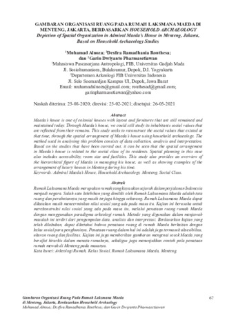 Muhamad, Alnoza and Desfira, Ramadhania Rousthesa and Garin, Dwiyanto Pharmasetiawan (2021) Gambaran organisasi ruang pada rumah Laksmana Maeda di Menteng, Jakarta, berdasarkan Household Archaeology. Forum Arkeologi, 34 (2): 1. pp. 67-82. ISSN 0854-3232