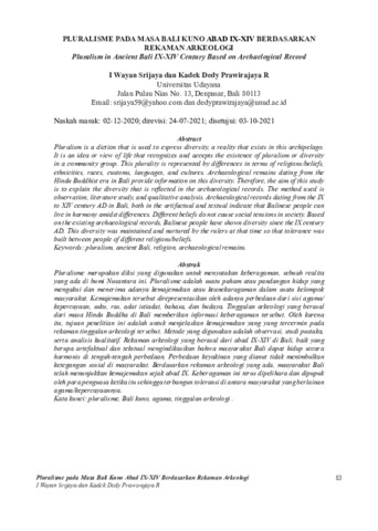 itu, tujuan penelitian ini adalah untuk menjelaskan kemajemukan yang yang tercermin pada rekaman tinggalan arkeologi tersebut. Metode yang digunakan adalah observasi, studi pustaka,serta analisis kualitatif. Rekaman arkeologi yang berasal dari abad IX-XIV di Bali, baik yang berupa artefaktual dan tekstual mengindikasikan bahwa masyarakat Bali dapat hidup secara harmonis di tengah-tengah perbedaan. Perbedaan keyakinan yang dianut tidak menimbulkan ketegangan sosial di masyarakat. Berdasarkan rekaman arkeologi yang ada, masyarakat Bali telah menunjukkan kemajemukan sejak abad IX. Keberagaman ini terus dipelihara dan dipupuk oleh para penguasa ketika itu sehingga terbangun toleransi di antara masyarakat yang berlainan agama/kepercayaannya