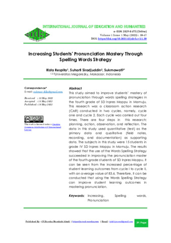 Rista, Respita and Suharti, Siradjuddin and Sukmawati, Sukmawati (2022) Increasing students’ pronunciation mastery through spelling words strategy. International Journal of Education and Humanities, 1 (1): 4. pp. 39-47. ISSN 2830-4578