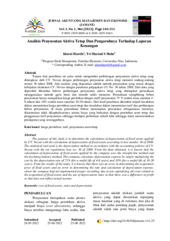Idarni, Harefa and Tri, Hartati S Hulu (2022) Analisis penyusutan aktiva tetap dan pengaruhnya terhadap laporan keuangan. Jurnal Akuntansi, Manajemen dan Ekonomi (Jamane), 1 (1): 17. pp. 146-151. ISSN 2829-8888