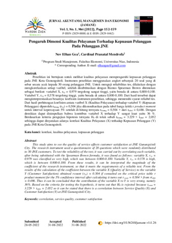 Nov, Elhan Gea and Cardinal, Pranatal Mendrofa (2022) Pengaruh dimensi kualitas pelayanan terhadap kepuasan pelanggan pada pelanggan JNE. Jurnal Akuntansi, Manajemen dan Ekonomi (Jamane), 1 (1): 18. pp. 152-159. ISSN 2829-8888