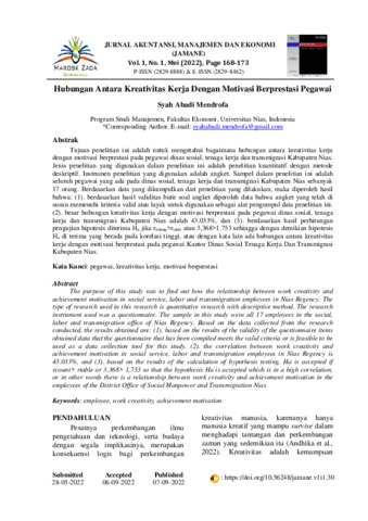 Syah, Abadi Mendrofa (2022) Hubungan antara kreativitas kerja dengan motivasi berprestasi pegawai. Jurnal Akuntansi, Manajemen dan Ekonomi (Jamane), 1 (1): 20. pp. 168-173. ISSN 2829-8888