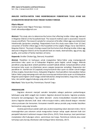 Ellyvia, Abiyani (2022) Analisis faktor-faktor yang mempengaruhi permintaan telur ayam ras di Kabupaten Magetan pada tingkat rumah tangga. Journal of Economics and Social Sciences (JESS), 1 (1): 2. pp. 11-22. ISSN 2830-5337