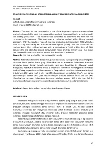 Isnawati, Isnawati (2022) Analisis kebutuhan dan konsumsi beras masyarakat Indonesia tahun 2021. Journal of Economics and Social Sciences, 1 (1): 5. pp. 42-48. ISSN 2830-5337