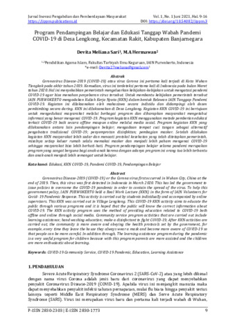 Devita, Meliana Sari and M.A, Hermawan (2022) Program pendampingan belajar dan edukasi tanggap wabah pandemi Covid-19 di Desa Lengkong, Kecamatan Rakit, Kabupaten Banjarnegara. Jurnal Inovasi Pengabdian dan Pemberdayaan Masyarakat, 1 (1): 2. pp. 9-16. ISSN 2830-2303