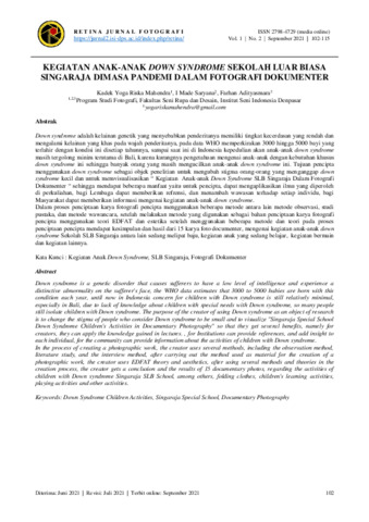 Kadek, Yoga Riska Mahendra and I, Made Saryana and Farhan, Adityasmara (2021) Kegiatan anak-anak down syndrome Sekolah Luar Biasa Singaraja di masa pandemi dalam fotografi dokumenter. Retina Jurnal Fotografi, 1 (2): 5. pp. 102-115. ISSN 2798-4729