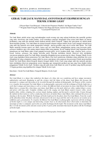 I, Wayan Open Yusa Balayasa and Cokorda, Istri Puspawati Nindhia and Ida, Bagus Candra Yana (2021) Gerak tari jauk manis dalam fotografi ekspresi dengan teknik strobo light. Retina Jurnal Fotografi, 1 (2): 8. pp. 137-146. ISSN 2798-4729