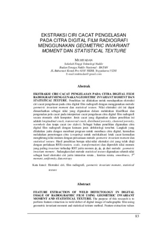EKSTRAKSI CIRI CACAT PENGELASAN PADA CITRA DIGITAL FILM RADIOGRAFI MENGGUNAKAN GEOMETRIC INVARIANT MOMENT DAN STATISTICAL TEXTURE.pdf