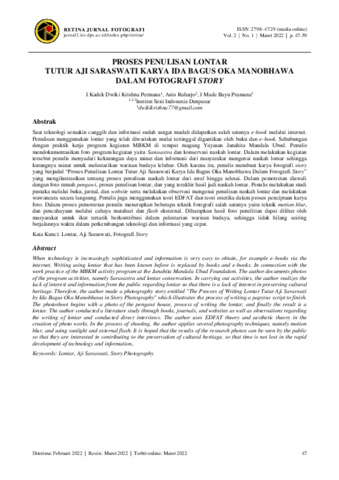 I, Kadek Dwiki Krishna Permana and Anis, Raharjo and I, Made Bayu Pramana (2022) Proses penulisan lontar tutur Aji Saraswati karya Ida Bagus Oka Manobhawa dalam fotografi story. Retina Jurnal Fotografi, 2 (1): 5. pp. 47-59. ISSN 2798-4729