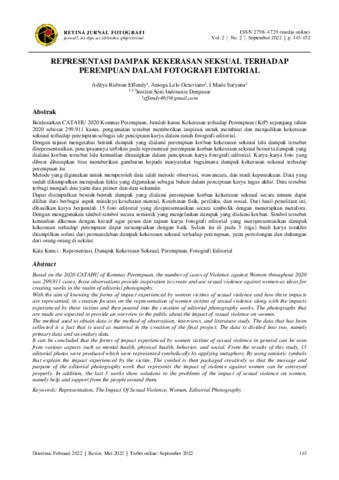 Aditya, Ridwan Effendy and Amoga, Lelo Octaviano and I, Made Saryana (2022) Representasi dampak kekerasan seksual terhadap perempuan dalam fotografi editorial. Retina Jurnal Fotografi, 2 (2): 2. pp. 143-152. ISSN 2798-4729