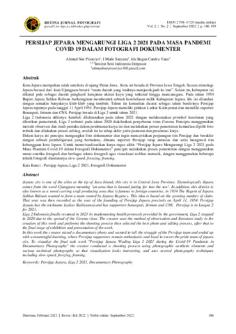 Ahmad, Nur Nur Prasetyo and I, Made Saryana and Ida, Bagus Candra Yana (2022) Persijap Jepara mengarungi liga 2 2021 pada masa pandemi Covid 19 dalam fotografi dokumenter. Retina Jurnal Fotografi, 2 (2): 6. pp. 186-199. ISSN 2798-4729