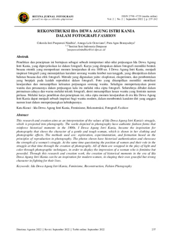 Cokorda, Istri Puspawati Nindhia and Amoga, Lelo Octaviano and Putu, Agus Bratayadnya (2022) Rekonstruksi Ida Dewa Agung Istri Kania dalam fotografi fashion. Retina Jurnal Fotografi, 2 (2): 10. pp. 237-242. ISSN 2798-4729