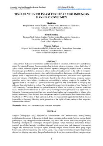 Mukhlisin, Mukhlisin and Fetri, Fatorina and Chamid, Sutikno (2022) Tinjauan hukum Islam terhadap perlindungan hak-hak konsumen. Economics, Social, and Humanities Journal, 2 (1): 1. pp. 1-28. ISSN 2798-6926