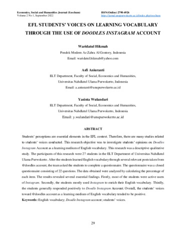 Waridatul, Hikmah and Asfi, Aniuranti and Wulandari, Yasinta (2022) EFL students’ voices on learning vocabulary through the use of doodles instagram account. Economics, Social, and Humanities Journal, 2 (1): 2. pp. 29-38. ISSN 2798-6926