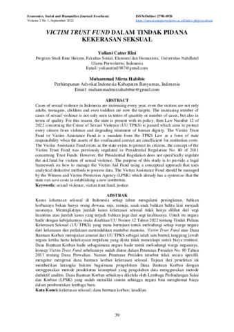 Yuliani, Catur Rini and Muhammad, Mirza Habibie (2022) Victim trust fund dalam tindak pidana kekerasan seksual. Economics, Social, and Humanities Journal, 2 (1): 3. pp. 39-56. ISSN 2798-6926