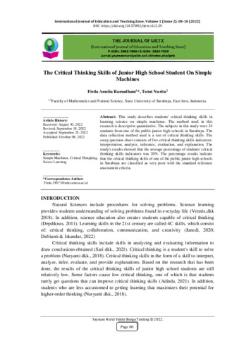 Firda, Amelia Ramadhani and Tutut, Nurita (2022) The critical thinking skills of junior high school student on simple machines. International Journal of Education and Teaching Zone, 1 (2): 1. pp. 60-68. ISSN 2963-7899