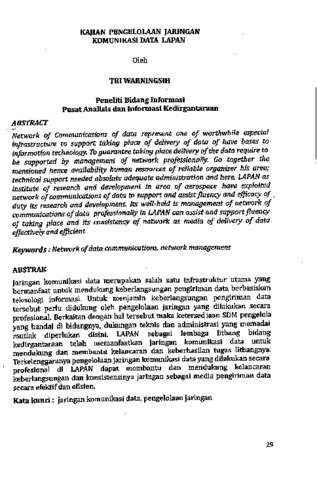 Jaringan komunikasi data merupakan salah satu infrastruktur utama yang bermanfaat untuk mendukung keberlangsungan pengiriman data berbasiskan teknologi informasi. Untuk menjamin keberlangsungan pengiriman data tersebut perlu didukung oleh pengelolaan jaringan yang dilakukan secara profesional. Berkaitan dengan hal tersebut maka ketersediaan SDM pengelola yang handal di bidangnya, dukungan teknis dan administrasi yang memadai mutlak diperlukan disini. LAPAN sebagai lembaga litbang bidang kedirgantaraan telah memanfaatkan jaringan komunikasi data untuk mendukung dan membantu kelancaran dan keberhasilan tugas litbangnya. Terselenggaranya pengelolaan jaringan komunikasi data yang dilakukan secara profesional di LAPAN dapat membantu dan mendukung kelancaran keberlangsungan dan konsistensinya jaringan sebagai media pengiriman data secara efektif dan efisien