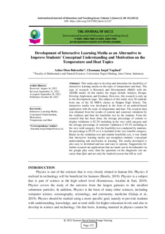 Azhar, Dion Bahrudin and Chusnana, Insjaf Yogihati (2022) Development of interactive learning media as an alternative to improve students' conceptual understanding and motivation on the temperature and heat topics. International Journal of Education and Teaching Zone, 1 (2): 9. pp. 132-145. ISSN 2963-7899