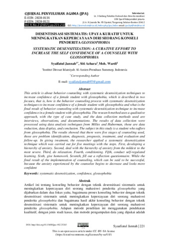Syaifatul Jannah and Siti Azhara and Moh. Wardi (2022) Desensitisasi sistematis: upaya kuratif untuk meningkatkan kepercayaan diri seorang konseli penderita glossophobia. Jurnal Penyuluhan Agama, 9 (2): 6. pp. 221-232. ISSN 2828-0121