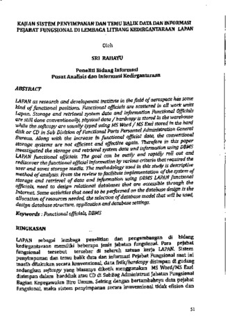 LAPAN sebagai lembaga penelitian dan pengembangan di bidang kedirgantaraan memiliki beberapa jenis jabatan fungsional. Para pejabat fungsional tersebut tersebar di seluruh satuan kerja LAPAN. Sistem penyimpanan dan temu balik data dan informasi Pejabat Fungsional saat ini masih dilakukan secara konvensional, data fisik/hardcopy disimpan di gudang sedangkan softcopy yang biasanya diketik menggunakan MS Word/MS Exel disimpan dalam harddisk atau CD di SubBag Administrasi Jabatan Fungsional Bagian Kepegawaian Biro Umum. Seiring dengan bertambahnya data pejabat fungsional, maka sistem penyimpanan secara konvensional tidak efisien dan efektif lagi. Oleh karena itu pada makalah ini dikaji system penyimpanan dan temu balik data dan informasi pejabat fungsional LAPAN menggunakan Sistem Manajemen Basis Data (SMBD). Tujuannya dapat dengan mudah dan cepat menyajikan dan menemukan kembali informasi pejabat fungsional dengan berbagai kriteria yang dibutuhkan pengguna serta menghemat media penyimpanan. Metodologi yang digunakan dalam kajian ini adalah metode deskriptif analisis. Dari hasil kajian untuk memudahkan pengimplementasian system penyimpanan dan temu balik data dan informasi pejabat fungsional LAPAN menggunakan SMBD, perlu dirancang basisdata relasional yang dapat diakses melalui internet. Beberapa kegiatan yang perlu dilakukan pada perancangan basisdata adalah pengalokasian sumberdaya yang dibutuhkan, pemilihan model basisdata yang akan digunakan, perancangan struktur basisdata, penerapan dan pengaturan basisdata.