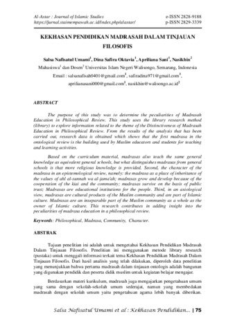 Salsa Nafisatul Umami and Dina Safira Oktavia and Apriliana Sani and Nasikhin (2022) Kekhasan pendidikan Madrasah dalam tinjauan filosofis. Al-Astar: Journal of Islamic Studies, 1 (2): 5. pp. 75-87. ISSN 2829-3339