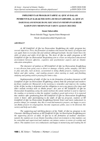 Imam Subawaihin (2022) Implementasi program tahfiz Al-Qur’an dalam pembentukan karakter siswa di MI Litahfizhil Al-Qur’an Darussalam Sengkubang Kecamatan Mempawah Hilir Kabupaten Mempawah tahun ajaran 2021/2022. Al-Astar: Journal of Islamic Studies, 1 (2): 7. pp. 100-119. ISSN 2829-3339