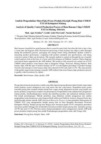 Muh. Agus Ferdian and Gettik Andri Purwanti and Nunuk Hariyani (2022) Analisis pengendalian mutu pada proses produksi keripik pisang batu UMKM XYZ di Kabupaten Malang. Green House: Jurnal Ilmu Pertanian dan Kehutanan, 1 (1): 3. pp. 19-31. ISSN 2963-1858