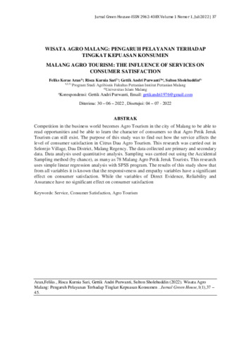 Feliks Kerae Aran and Risca Kurnia Sari and Gettik Andri Purwanti and Sulton Sholehuddin (2022) Wisata Agro Malang: pengaruh pelayanan terhadap tingkat kepuasan konsumen. Green House: Jurnal Ilmu Pertanian dan Kehutanan, 1 (1): 5. pp. 37-45. ISSN 2963-1858