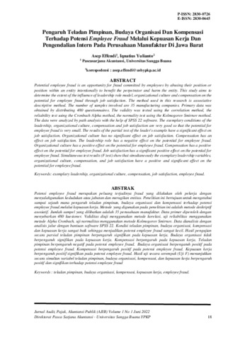 Asep Effendi and Iqnatius Yulianto (2022) Pengaruh teladan pimpinan, budaya organisasi dan kompensasi terhadap potensi employee fraud melalui kepuasan kerja dan pengendalian intern pada perusahaan manufaktur di Jawa Barat. Jurnal Audit, Pajak, Akuntansi Publik, 1 (1): 3. pp. 18-28. ISSN 2830-0726