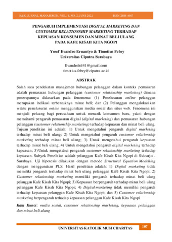 Yosef Evandro Ernantyo and Timotius Febry (2022) Pengaruh implementasi digital marketing dan customer relationship marketing terhadap kepuasan konsumen dan minat beli ulang pada kafe kisah kita ngopi. Konsumen & Konsumsi: Jurnal Manajemen, 1 (2): 3. pp. 107-128. ISSN 2808-4667