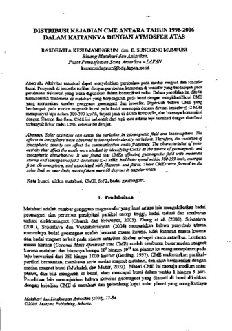 Aktivitas matahari dapat menyebabkan perubahan pada medan magnet dan ionosfer bumi. Pengaruh di ionosfer terlihat dengan perubahan kerapatan di ionosfer yang berdampak pada perubahan frekuensi yang biasa digunakan dalam komunikasi radio. Dalam penelitian ini diteliti karakteristik fenomena di matahari yang berpengaruh pada bumi dengan mengidentifikasi CME yang merupakan sumber gangguan geomagnet dan ionosfer. Diperoleh bahwa CME yang berdampak pada medan magnetik bumi pada badai menengah dengan deviasi ionosfer < -2 MHz mempunyai laju antara 300-399 lcm/dt, terjadi jauh di dalam kromosfer, dan biasanya berasosiasi dengan filamen dan flare. CME ini terbentuk dari tepi, atau sekitar tepi matahari dengan distribusi terbanyak lebar sudut CME sebesar 60 derajat