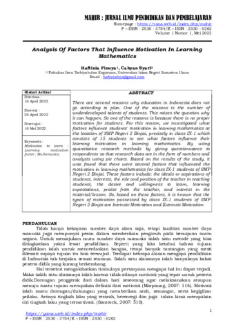 Haftinia, Finuya and Cahyan, Syari (2022) Analysis of factors that influence motivation in learning mathematics. Mahir: Jurnal Ilmu Pendidikan dan Pembelajaran, 1 (1): 1. pp. 1-10. ISSN 2830-3784