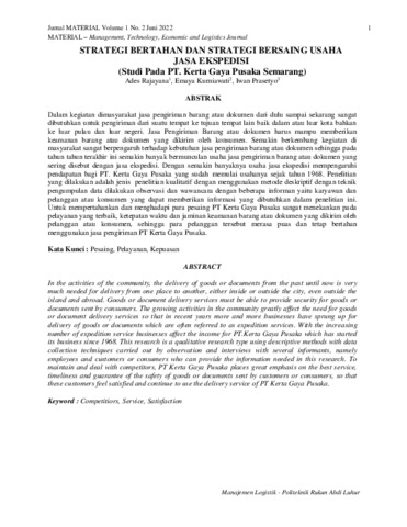 Ades, Rajayana and Emaya, Kurniawati and Iwan, Prasetyo (2022) Strategi bertahan dan strategi bersaing usaha jasa ekspedisi (studi pada PT. Kerta Gaya Pusaka Semarang). Jurnal Managemen, Transportasi, Ekonomi, dan Logistik, 1 (2): 1. pp. 1-8. ISSN 2808-4276