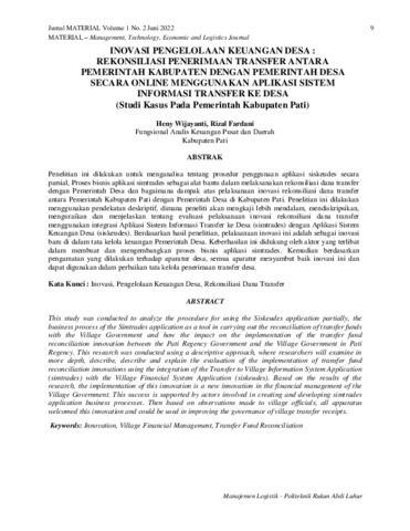 | Uncontrolled Keywords: | Inovasi, Pengelolaan keuangan desa, Rekonsiliasi dana transfer |