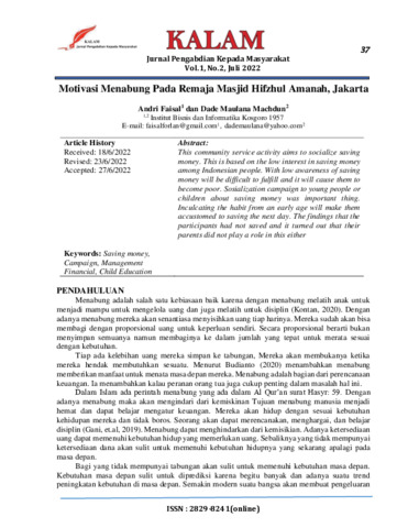 Andri, Faisal and Dade, Maulana Machdun (2022) Motivasi menabung pada remaja masjid Hifzhul Amanah, Jakarta. Jurnal Pengabdian Kepada Masyarakat Kalam, 1 (2): 1. pp. 37-47. ISSN 2829-8241