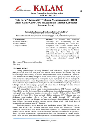 Rahmatullah, Pratama and Dike, Rama Putra and Widia, Firta (2022) Tata cara pelaporan SPT tahunan menggunakan e-Form (studi kasus: guru-guru di Kecamatan Talamau Kabupaten Pasaman Barat). Jurnal Pengabdian Kepada Masyarakat Kalam, 1 (2): 5. pp. 73-77. ISSN 2829-8241