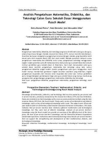 Zetra Hainul Putra and Neni Hermita and Jesi Alexander Alim (2022) Analisis pengetahuan matematika, didaktika, dan teknologi calon guru Sekolah Dasar menggunakan rasch model. Mosharafa: Jurnal Pendidikan Matematika, 10 (3): 1. 345 -356. ISSN 2086-4280