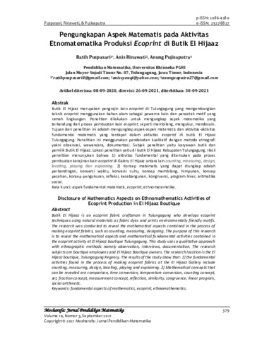 Ratih Puspasari and Anis Rinawati and Anung Pujisaputra (2021) Pengungkapan aspek matematis pada aktivitas etnomatematika produksi ecoprint di butik El Hijaaz. Mosharafa: Jurnal Pendidikan Matematika, 10 (3): 4. 379 -390. ISSN 2086-4280