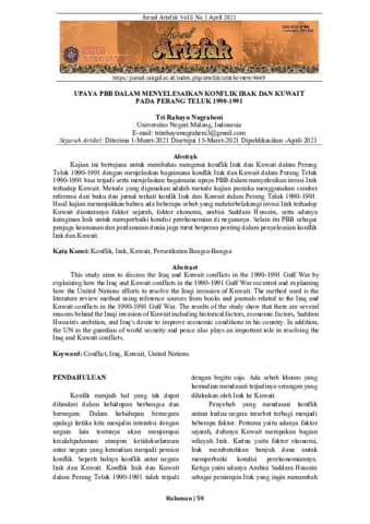 Tri Rahayu Nugraheni (2021) Upaya PBB dalam menyelesaikan konflik Irak dan Kuwait pada Perang Teluk 1990-1991. Jurnal Artefak, 8 (1). pp. 59-68. ISSN 2355-5726