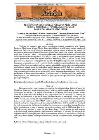 Fransiskus Xaverius Rema and Karolus Charlaes Bego and Damianus Rikardo Sumbi Wasa (2021) Pemanfaatan Situs Sejarah Pahlawan Mari Longa sebagai media dalam pembelajaran sejarah pada siswa kelas XI SMAN 1 Ende. Jurnal Artefak, 8 (1). pp. 37-50. ISSN 2355-5726
