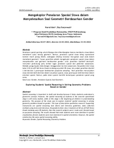 Nurul Aini and Eny Suryowati (2022) Mengeksplor penalaran spasial siswa dalam menyelesaikan soal geometri berdasarkan gender. Mosharafa: Jurnal Pendidikan Matematika, 11 (1): 6. pp. 61-72. ISSN 2086-4280