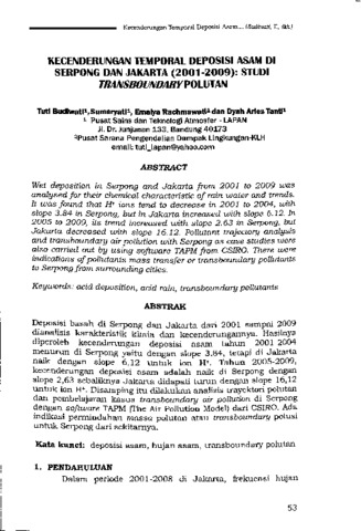 Deposisi basah di Serpong dan Jakarta dari 2001 sampai 2009 dianalisis karakteristik kimia dan kecenderungannya. Hasilnya diperoleh kecenderungan deposisi asam tahun 2001-2004 menurun di Serpong yaitu dengan. slope 3,84, tetapi di Jakarta naik dengan slope 6,12 untuk ion H+. Tahun 2005-2009, kecenderungan deposisi asam adalah naik di Serpong dengan slope 2,63 sebaliknya Jakarta didapati turun dengan slope 16,12 untuk ion H+. Disamping itu dilakukan analisis trayektori polutan dan pembelajaran kasus transboundary air pollution di Serpong dengan. software TAPM (The Air Pollution Model) dari CSIRO. Ada indikasi permindahan massa polutan atau transboundary polusi untuk Serpong dari sekitarnya.